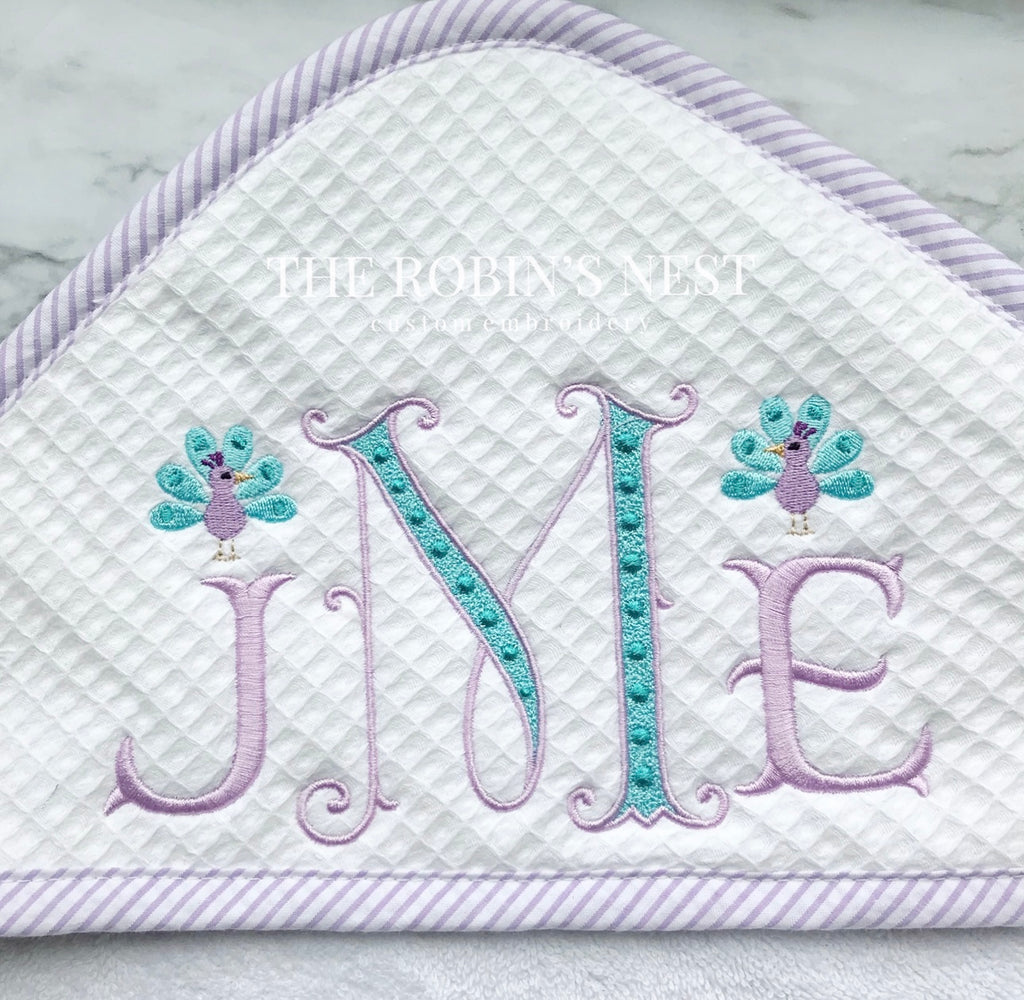 The softest hooded towel and washcloth set embroidered to perfection with your new bundle of joy’s monogram. The hood is covered in a pique layer and backed with terry cloth. Newborn to toddler range. Gift box included