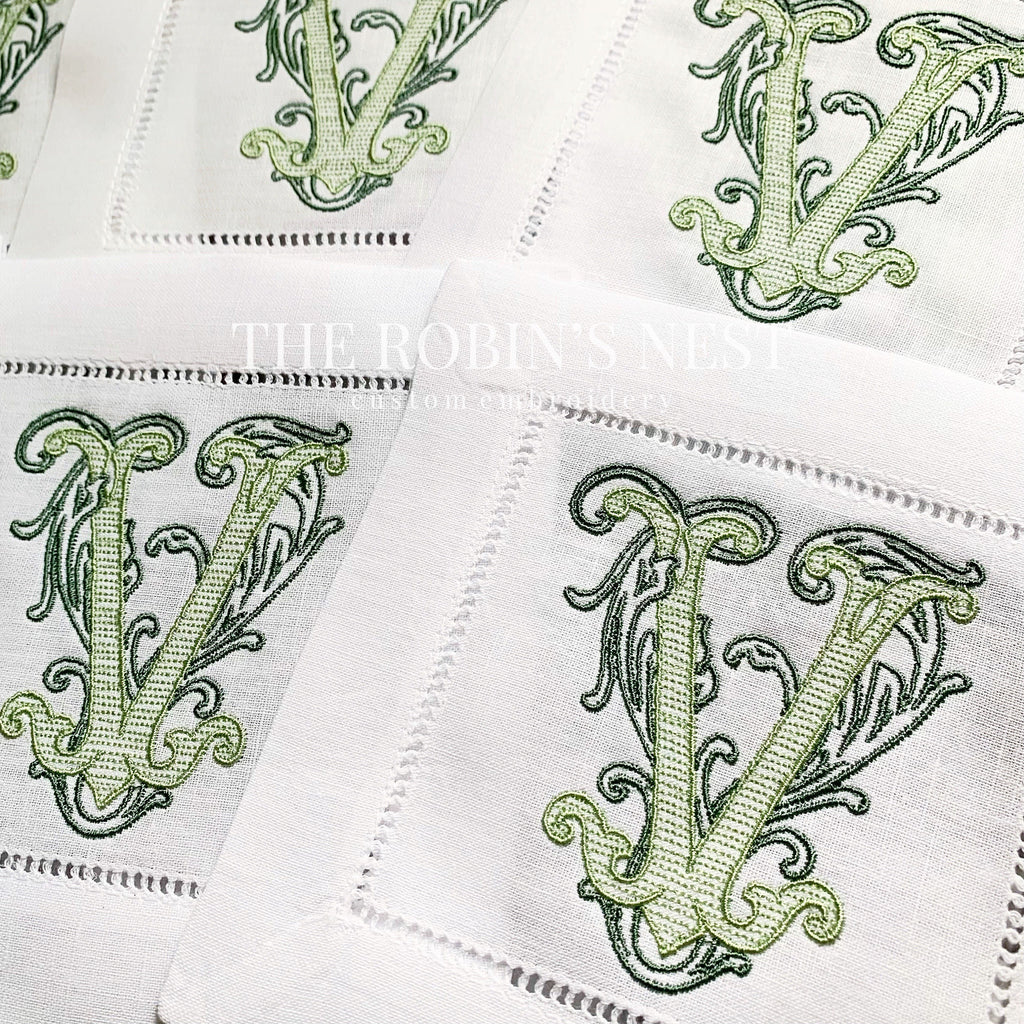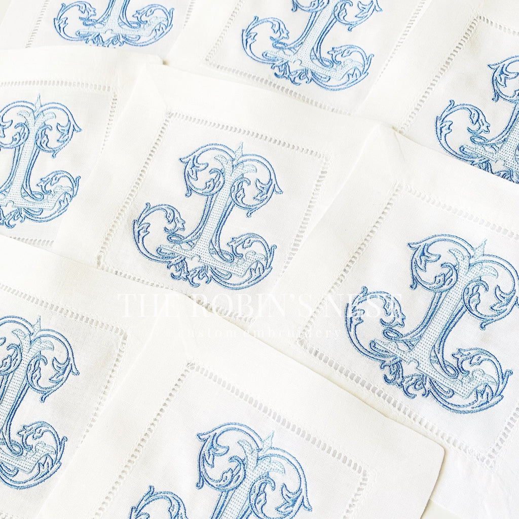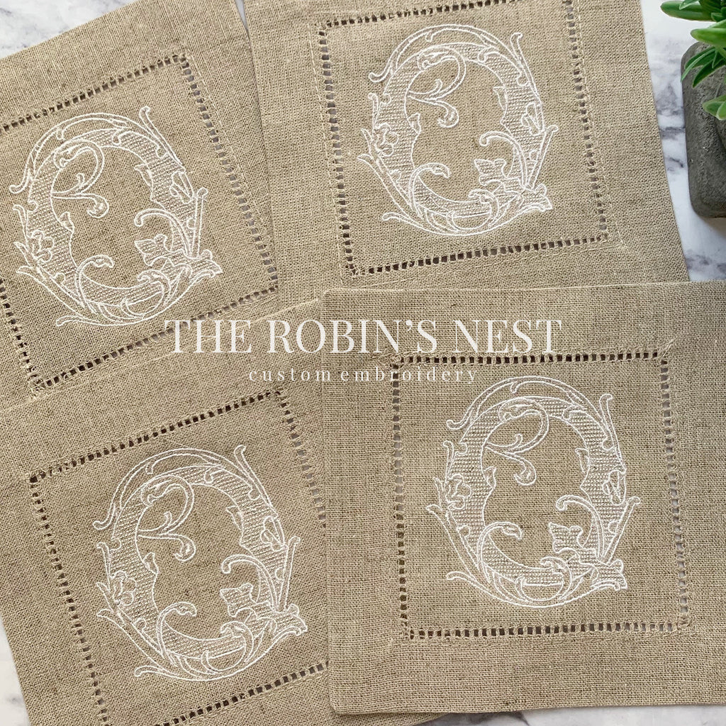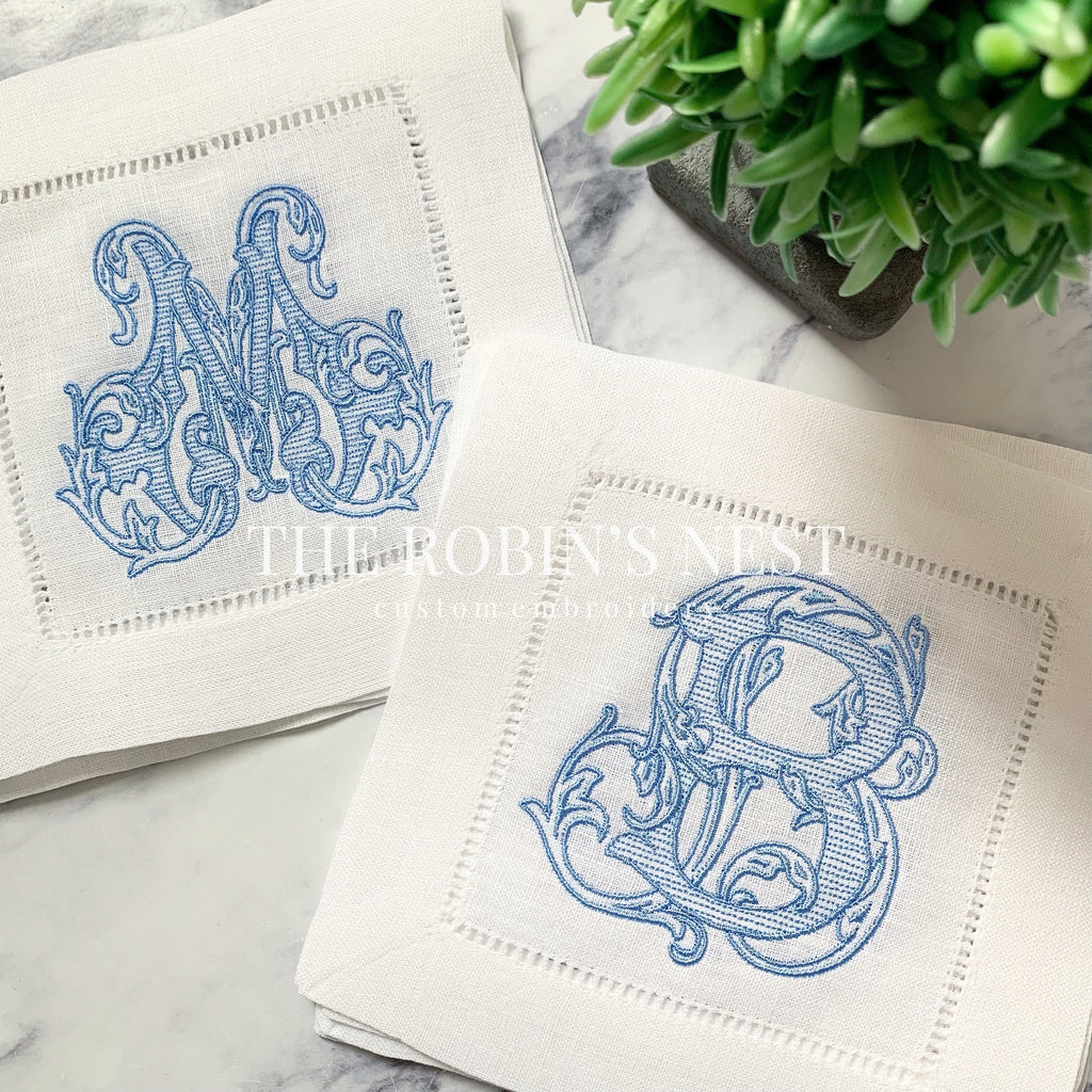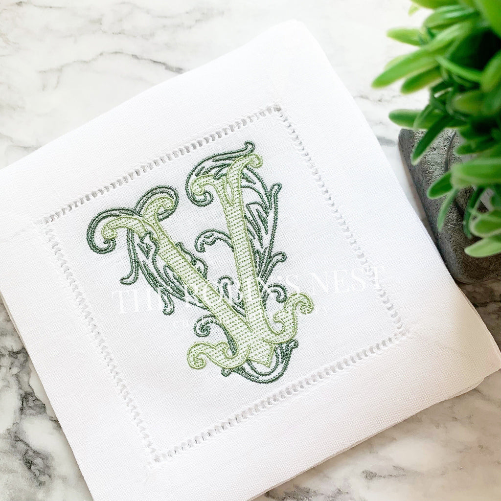 Beautiful set of linen hemstitched cocktail napkins perfect for any occasion! Our vintage vine monogram is a customer favorite!