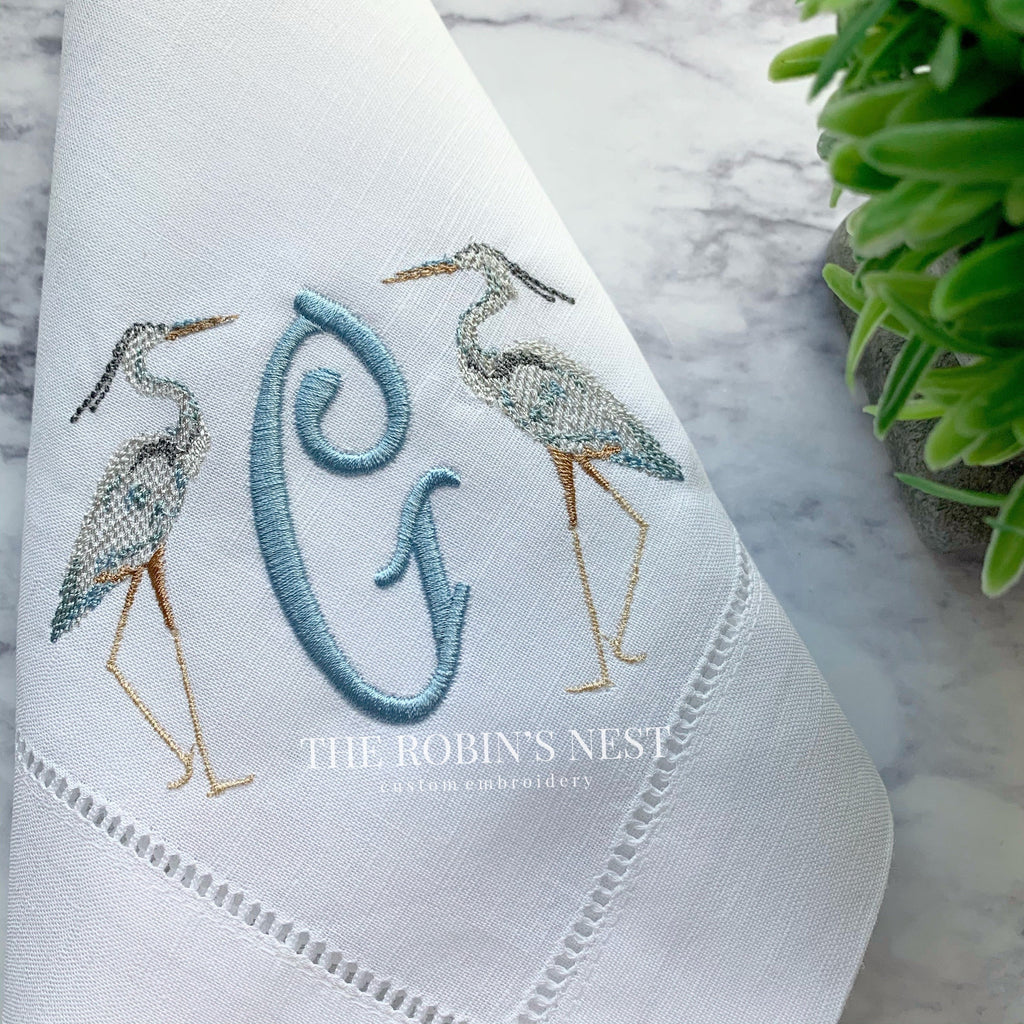 A beautiful great blue heron, stitched on our linen/cotton blend 20” hemstitched dinner napkins.