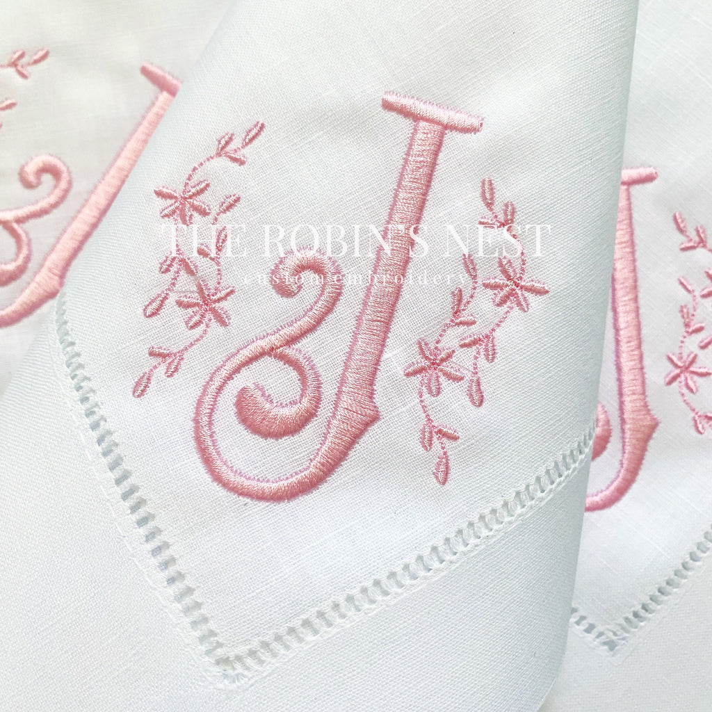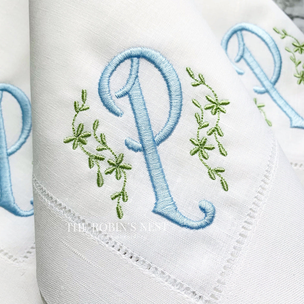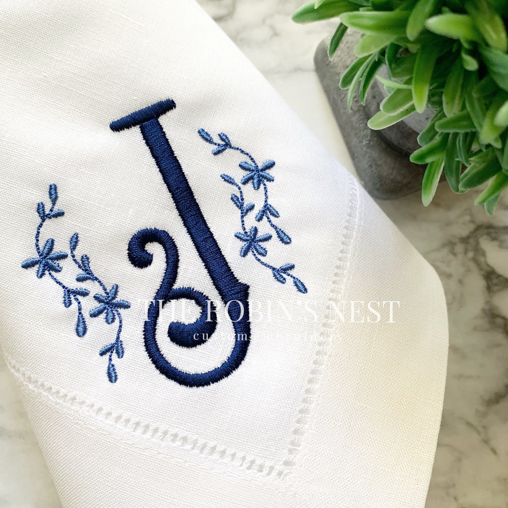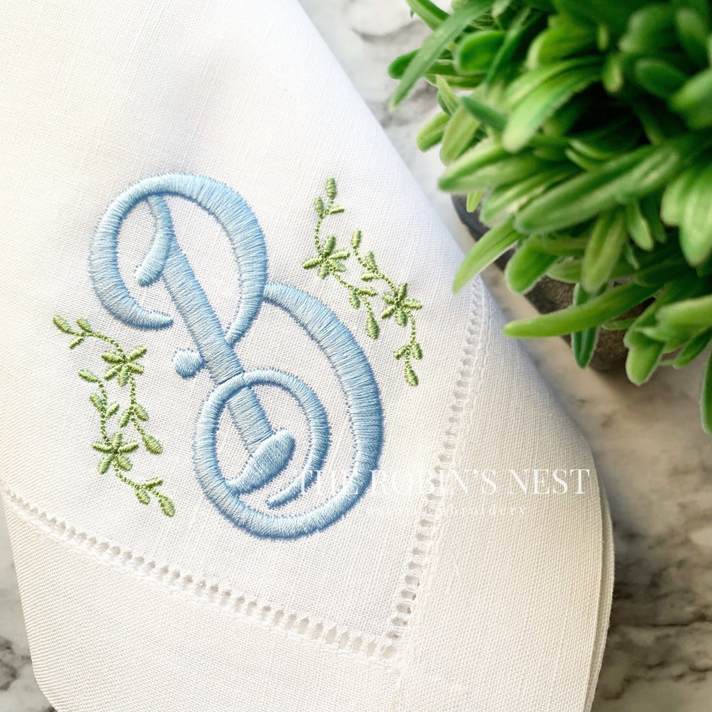 Beautiful linen/cotton blend napkins, embroidered to perfection for your table setting! A wide variety of custom thread choices make these beautiful napkins easy to match your china or any theme you have in mind! I love to create custom pieces for my clients. Message me for an extensive thread chart and a proof of your initials to create your perfect dinner napkins!