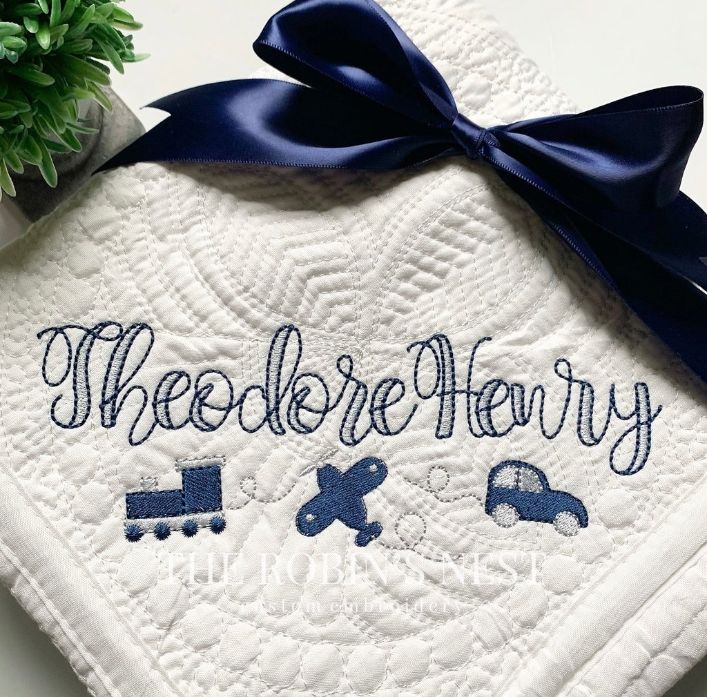 100% cotton baby quilt with scalloped edge. Dimensions 37” x 48”