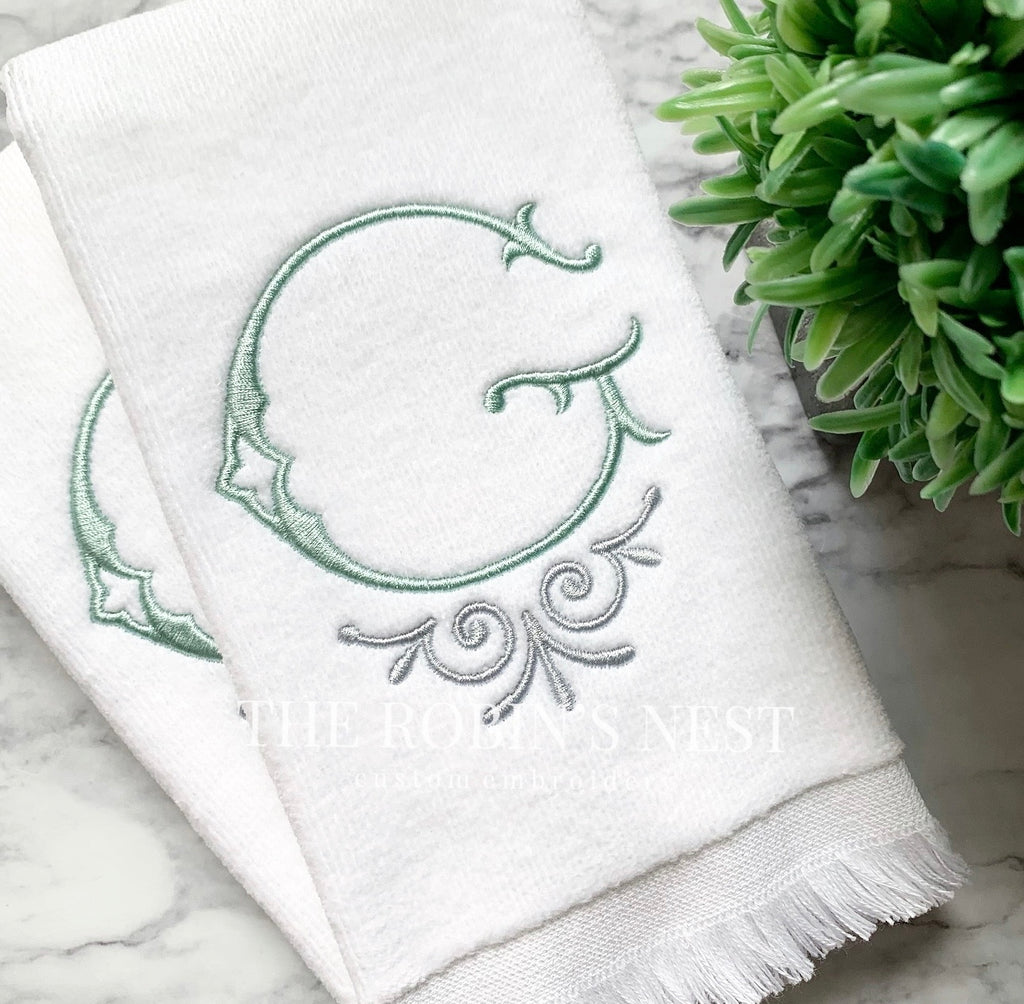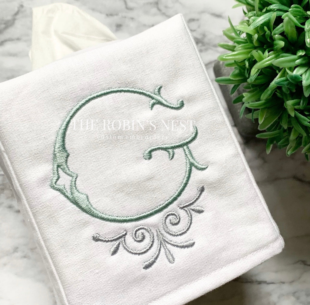 Beautifully embroidered fingertip towels and/or linen tissue cover with this classic monogram! These are the perfect accessories to complete the finishing touches to any bathroom. Your guests will definitely notice your attention to detail with these soft towels! Can be ordered individually or as a set.