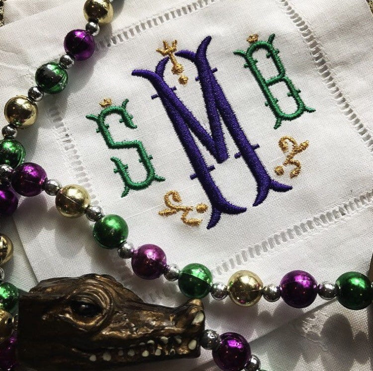 A set of four linen/cotton blend napkins, monogrammed for Mardi Gras.