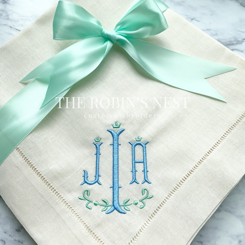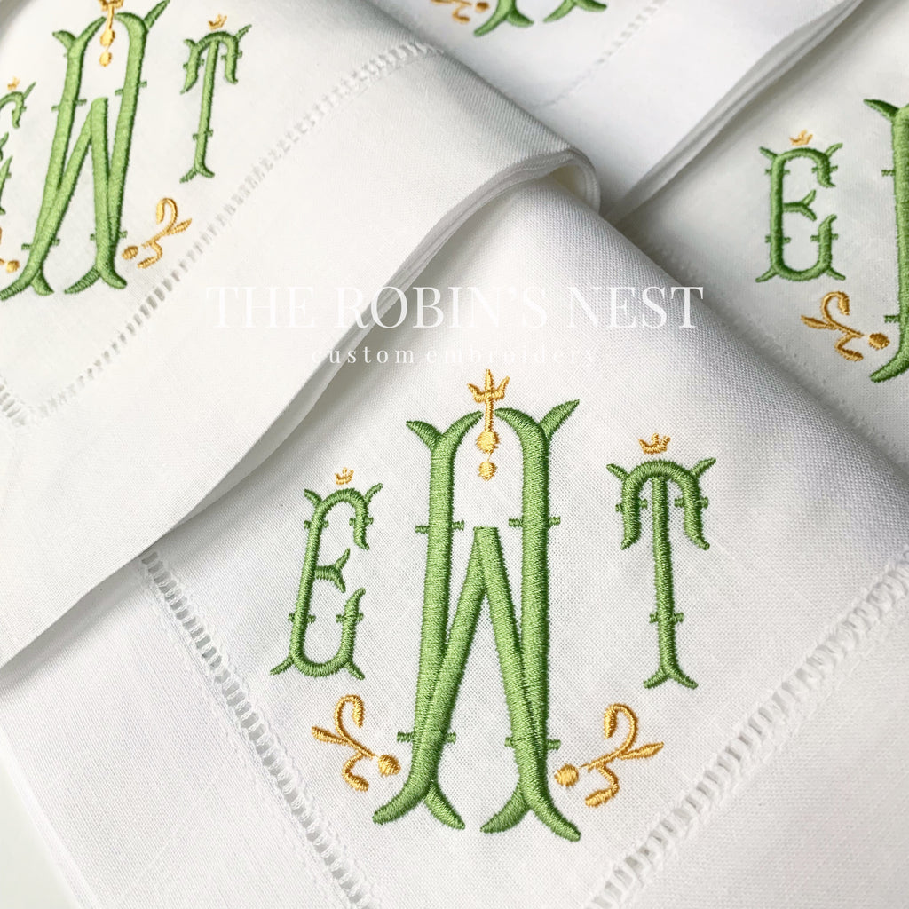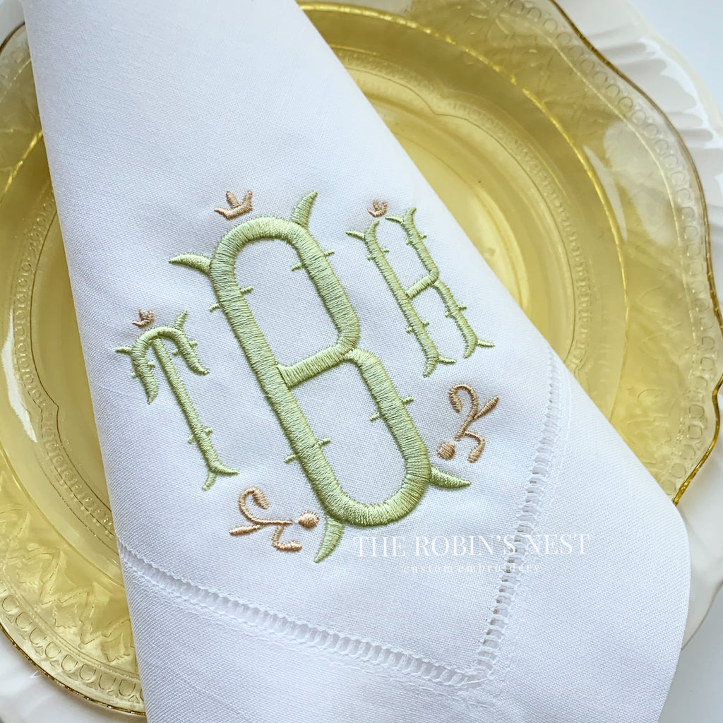Beautiful linen/cotton blend napkins, embroidered to perfection for your table setting! A wide variety of custom thread choices make these beautiful napkins easy to match your china or any theme you have in mind.