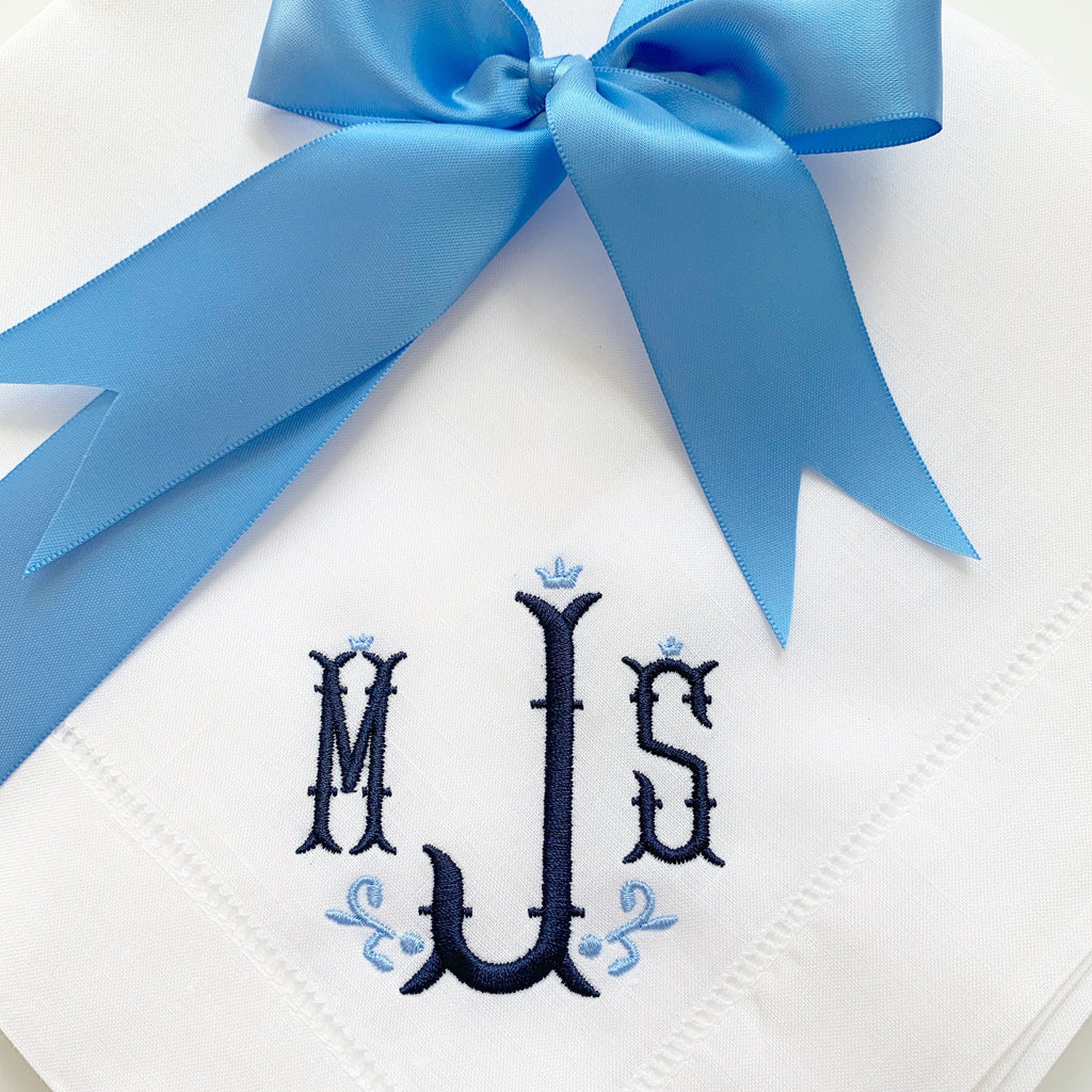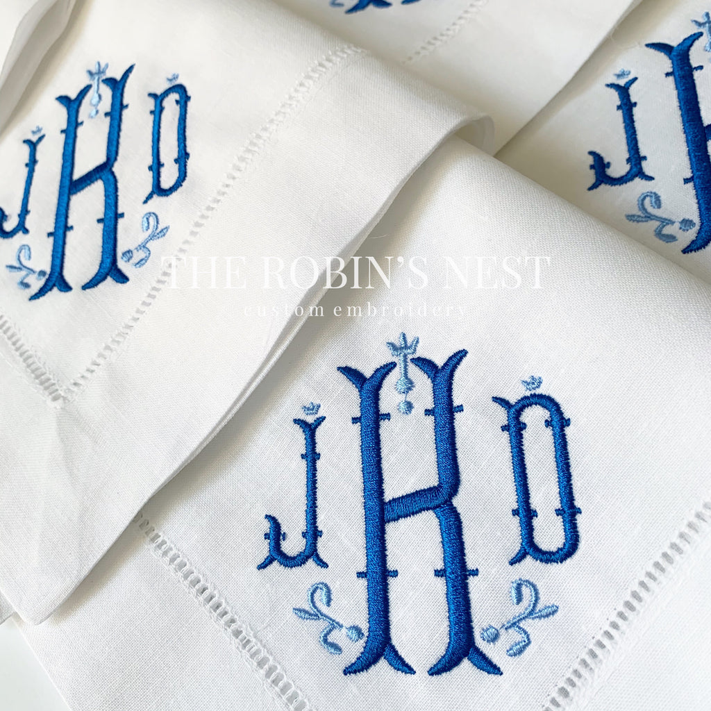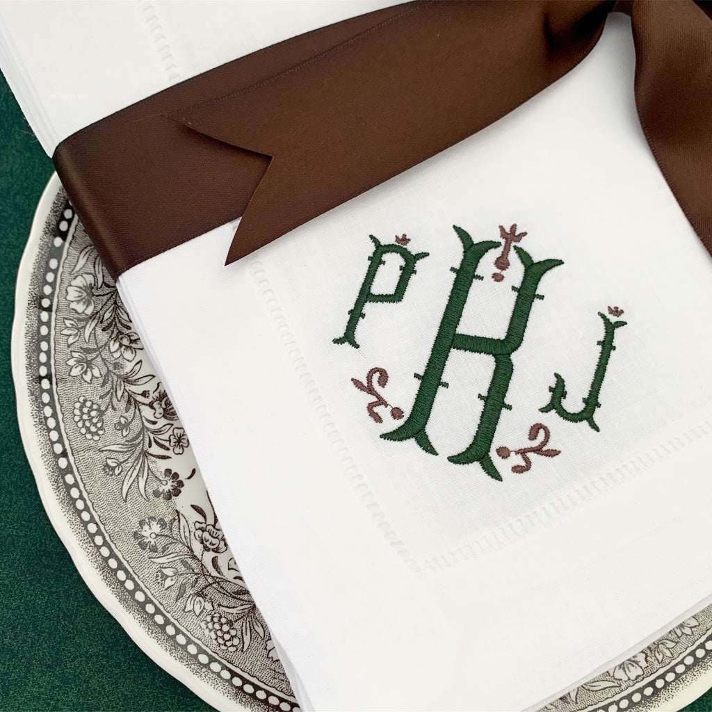 Beautiful linen/cotton blend napkins, embroidered to perfection for your table setting! A wide variety of custom thread choices make these beautiful napkins easy to match your china or any theme you have in mind.
