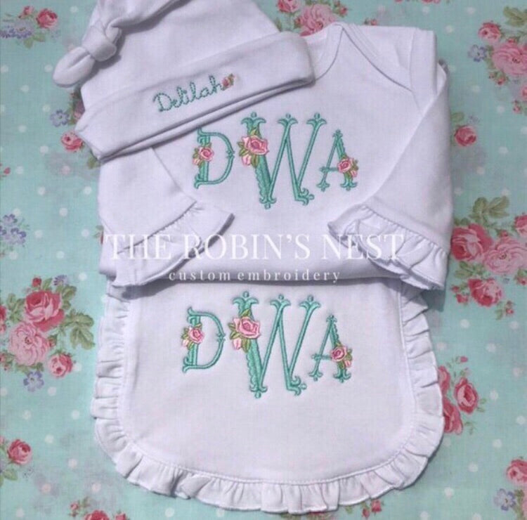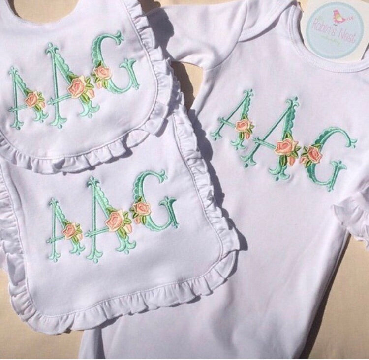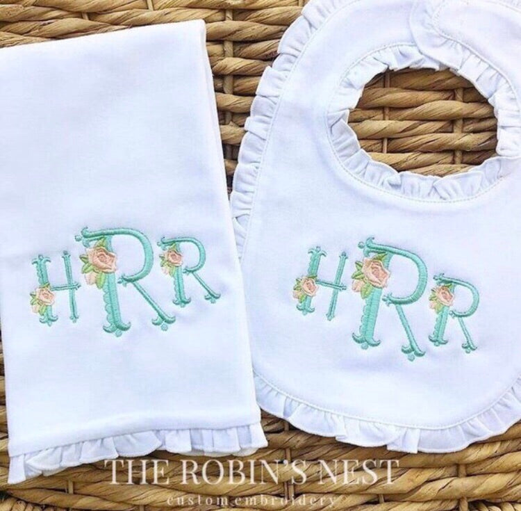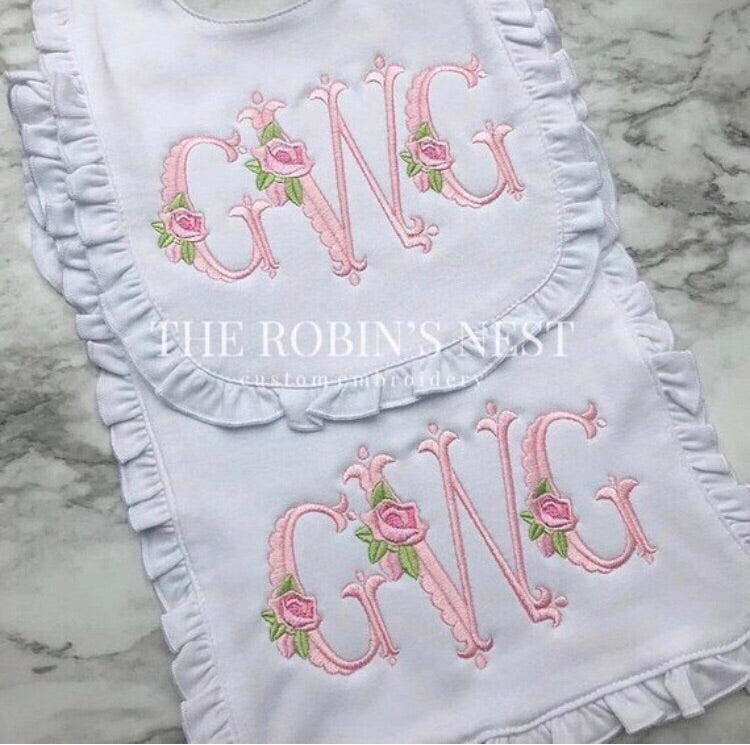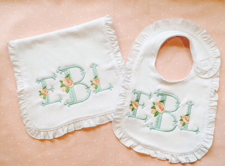 A beautiful ruffle bib and burp cloth, embroidered with a beautiful heirloom font for your little one!