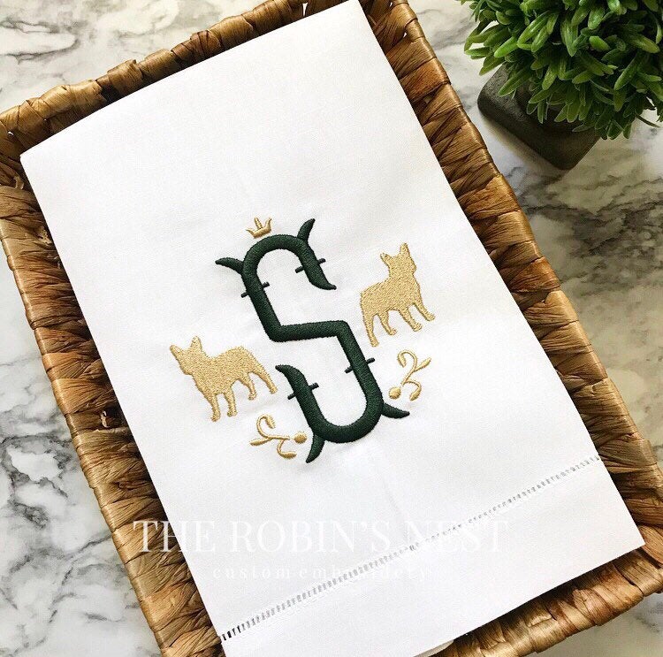 Linen/Cotton Blend Hemstitched Guest Towel - French Bulldog