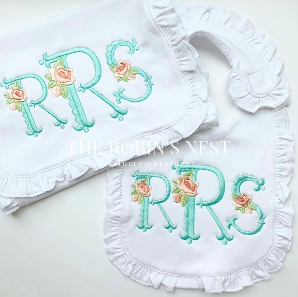 Pretty floral monogram for a ruffle bib, burp cloth and blanket. Order individually or as a set.