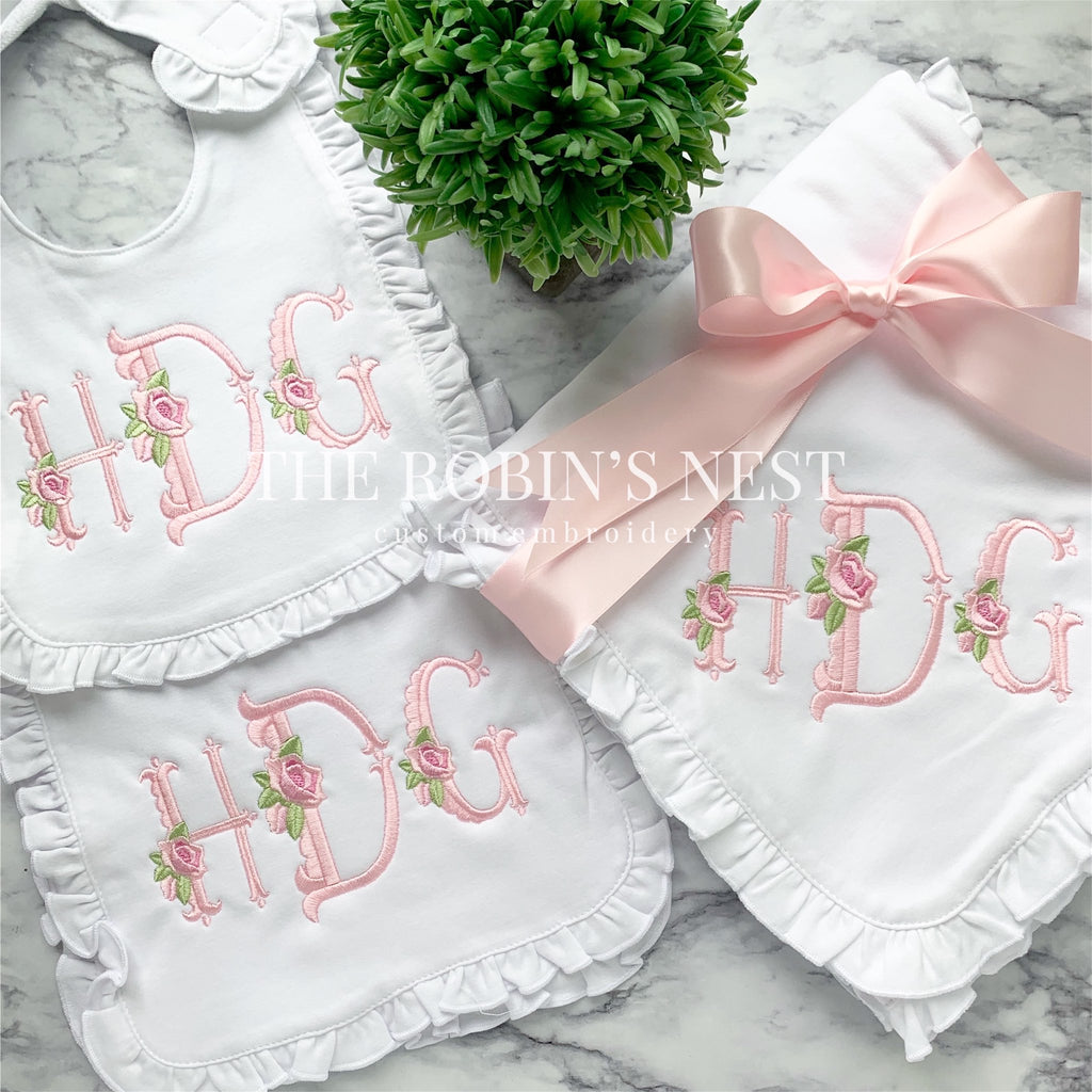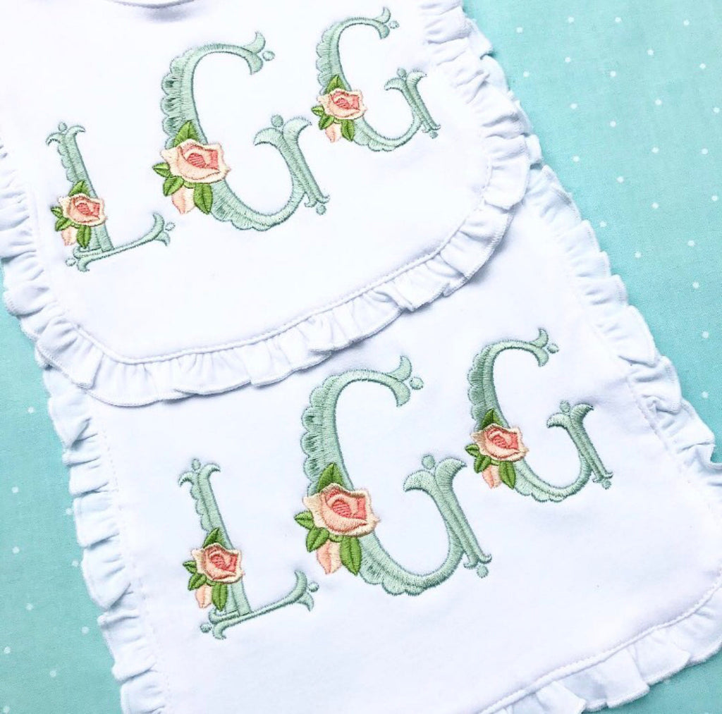 Ruffle Bib and Burp Cloth - Heirloom Floral Font