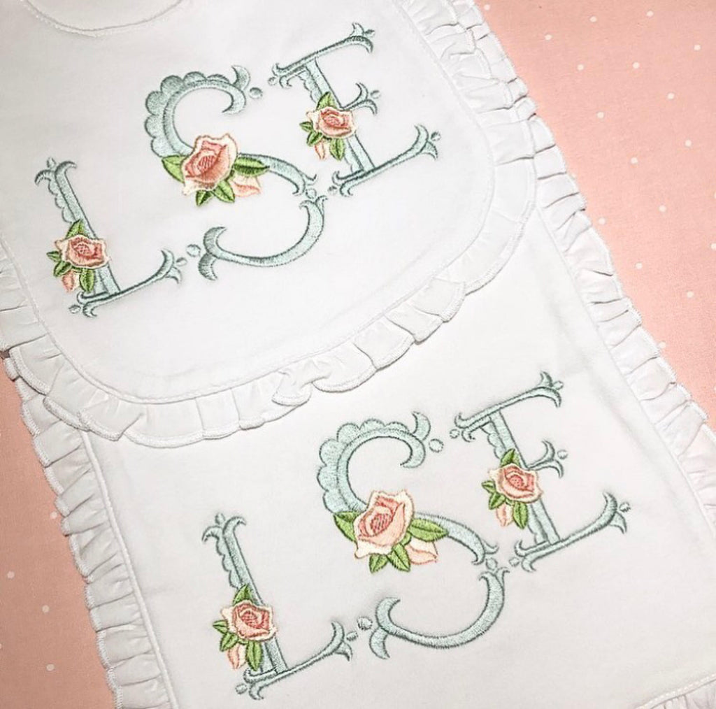 A beautiful set of ruffle bib and burp cloth, embroidered with a beautiful heirloom font for your little one!
